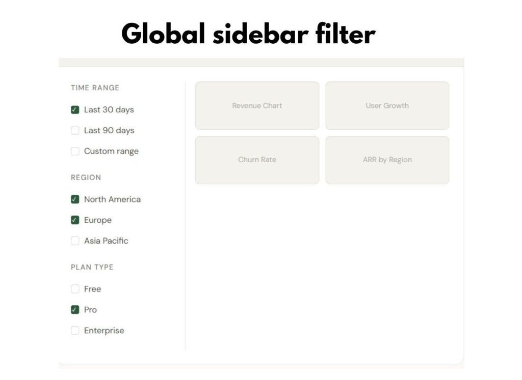 Filters should only control data that’s visible or relevant to the current view. For example, a “Invoice Status” filter on a User Activity dashboard can confuse users.