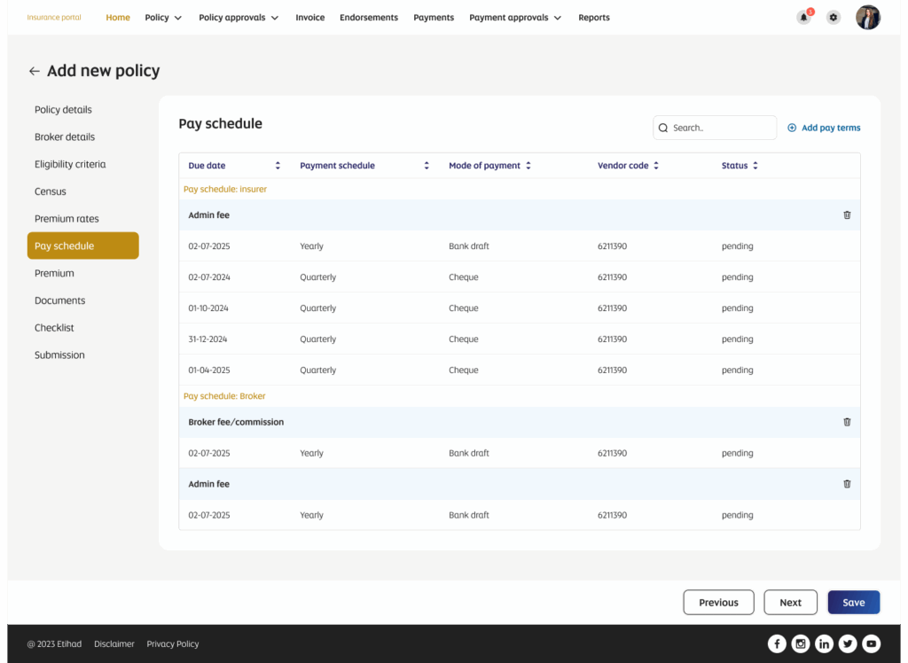 The dashboard provides a structured view of policy payment schedules, including due dates, payment frequency, mode of payment, vendor codes, and payment status. By consolidating insurer payments and broker commissions into a single interface, the system allows finance and operations teams to easily track pending payments, identify upcoming due dates, and maintain better financial control over policy transactions.