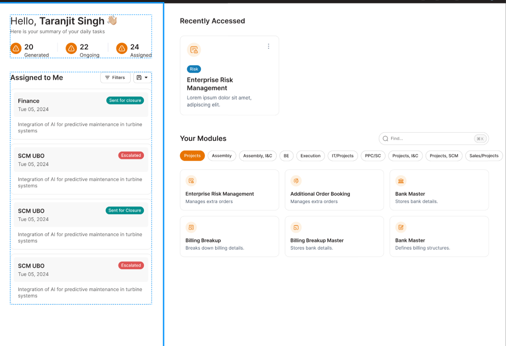 Our experts designed the enterprise operations dashboard to provide a centralized workspace where users can monitor assigned work, track task progress, and quickly access critical business modules in one place.