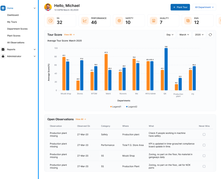 The dashboard allows operations leaders to quickly compare tour scores across departments like mould shop, maintenance, stores, QA, and production plants. By visualizing department-wise performance, plant heads can immediately identify areas that require attention and initiate corrective action before issues escalate.